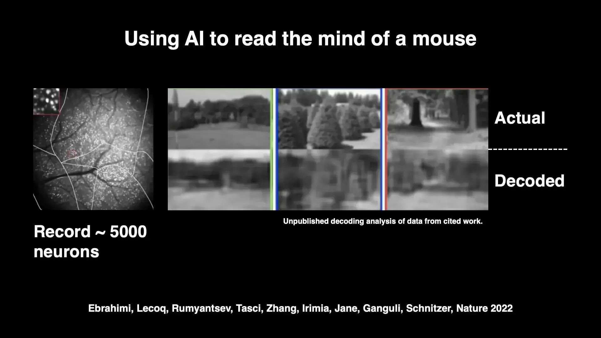 ตัวอย่างที่น่าสนใจคือ การทดลองกับหนูที่สามารถถอดรหัสภาพที่หนูเห็นจากกิจกรรมสมอง และสามารถเขียนกิจกรรมประสาทเพื่อทำให้หนูเห็นภาพที่เรากำหนดโดยควบคุมเพียง 20 เซลล์ประสาทเท่านั้น