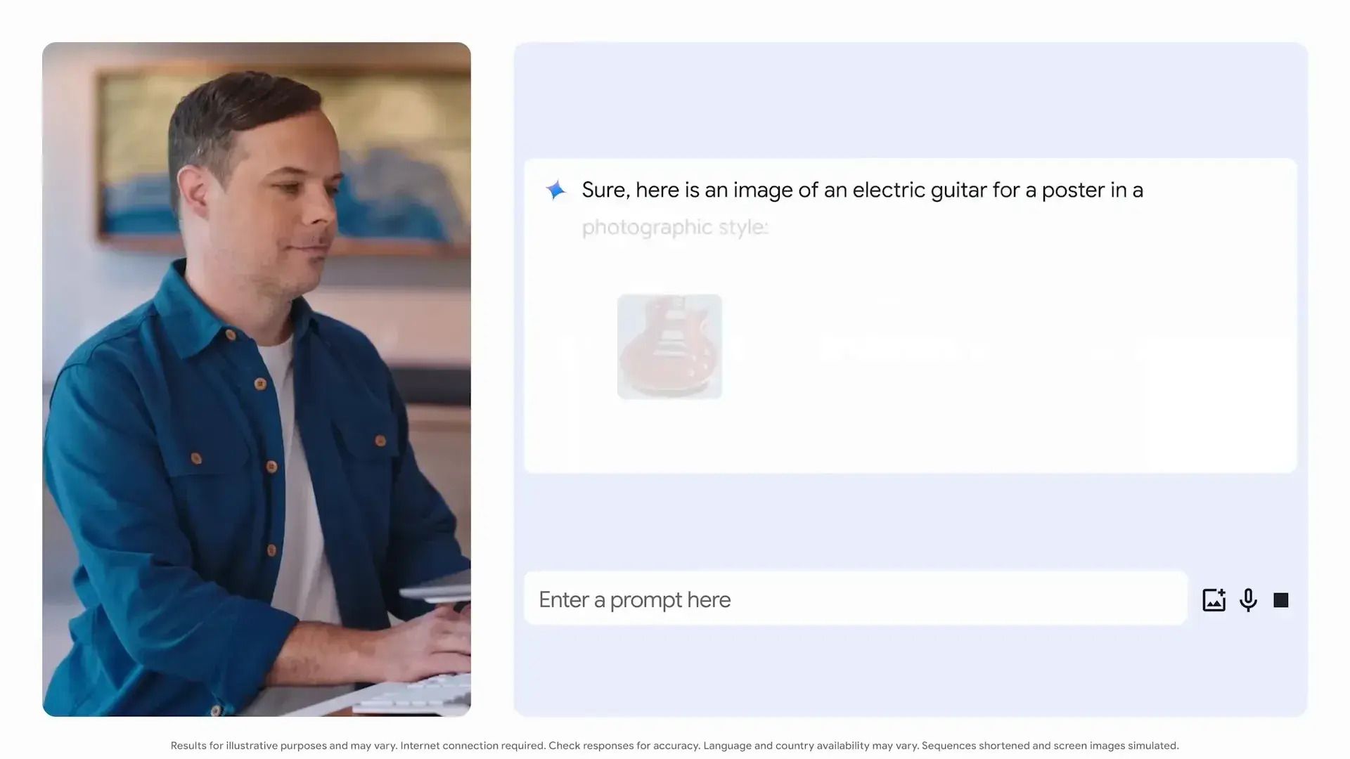 ตัวอย่างเช่น การสร้างภาพกีตาร์ไฟฟ้าสำหรับโปสเตอร์ด้วยสไตล์ภาพถ่ายที่มีสีสันสดใส และกีตาร์ลอยอยู่บนท้องฟ้า