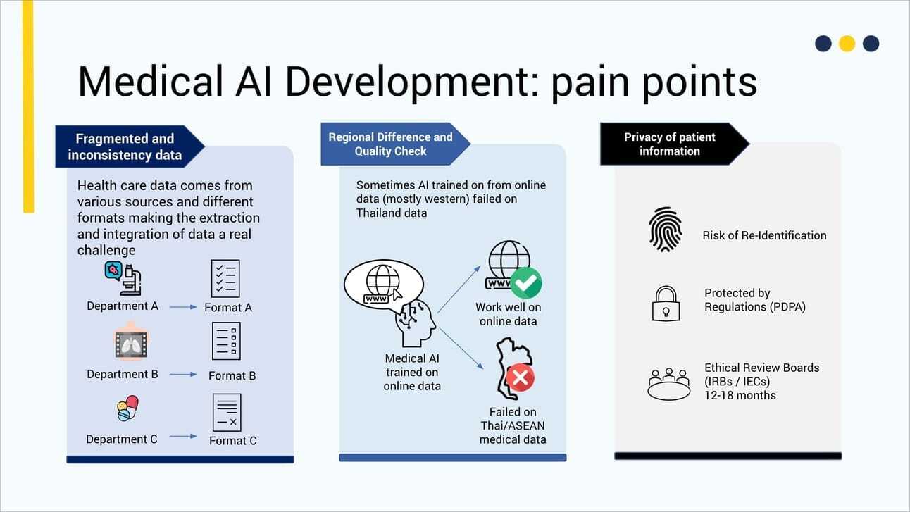 ไม่เพียงแค่คนนอกจะเข้าถึงข้อมูลไม่ได้ แต่แม้กระทั่งในโรงพยาบาลเองก็ยังมีปัญหา เข้าถึงข้อมูลของแต่ละหน่วยงานภายในไม่ได้ เพราะหน่วยงานต่างๆ มีรูปแบบการเก็บข้อมูลที่แตกต่างกันไป หากนำ AI มาช่วยงานได้จริง ก็จะต้องเสียเวลา Clean Data หรือจัดระเบียบข้อมูลอีกพักใหญ่