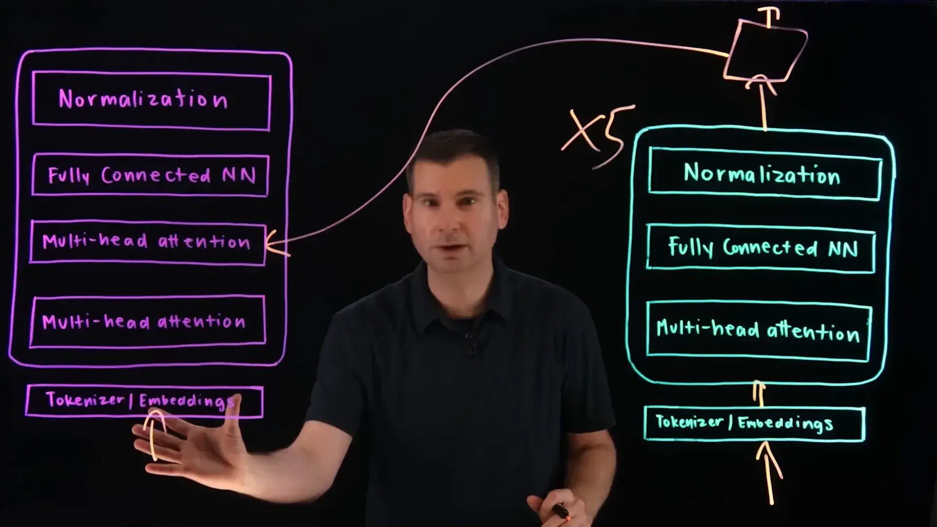 Encoder-Decoder Architecture: โครงสร้างพื้นฐานของโมเดลภาษาหลายๆ ตัว โดยส่วน Encoder ทำหน้าที่รับและประมวลผลข้อมูลอินพุต ส่วน Decoder ทำหน้าที่สร้างข้อมูลเอาต์พุต