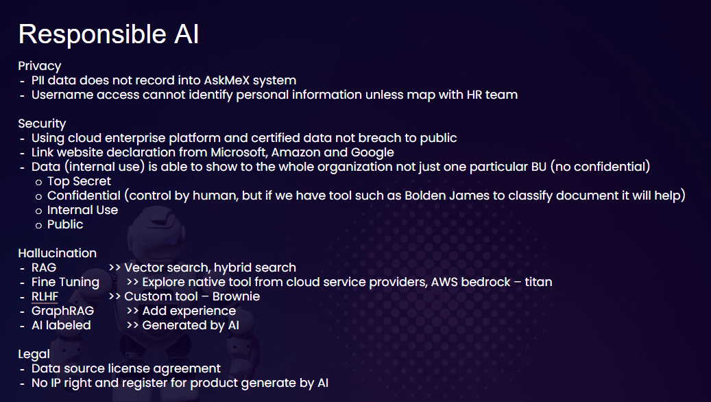 คุณณัฐพล กล่าวว่า ทุกวันนี้พนักงานสามารถใช้ AskMe GC ให้ช่วยประมวลข้อมูลในรูปแบบ Text หรือข้อความได้เท่านั้น ยังไม่สามารถใช้สร้างภาพได้ เนื่องจากการสร้างภาพมีความเสี่ยงที่จะนำข้อมูลละเมิดลิขสิทธิ์มาใช้สูงกว่า และแก้ไขยากกว่าเมื่อเทียบกับการประมวลผลเป็นข้อความ