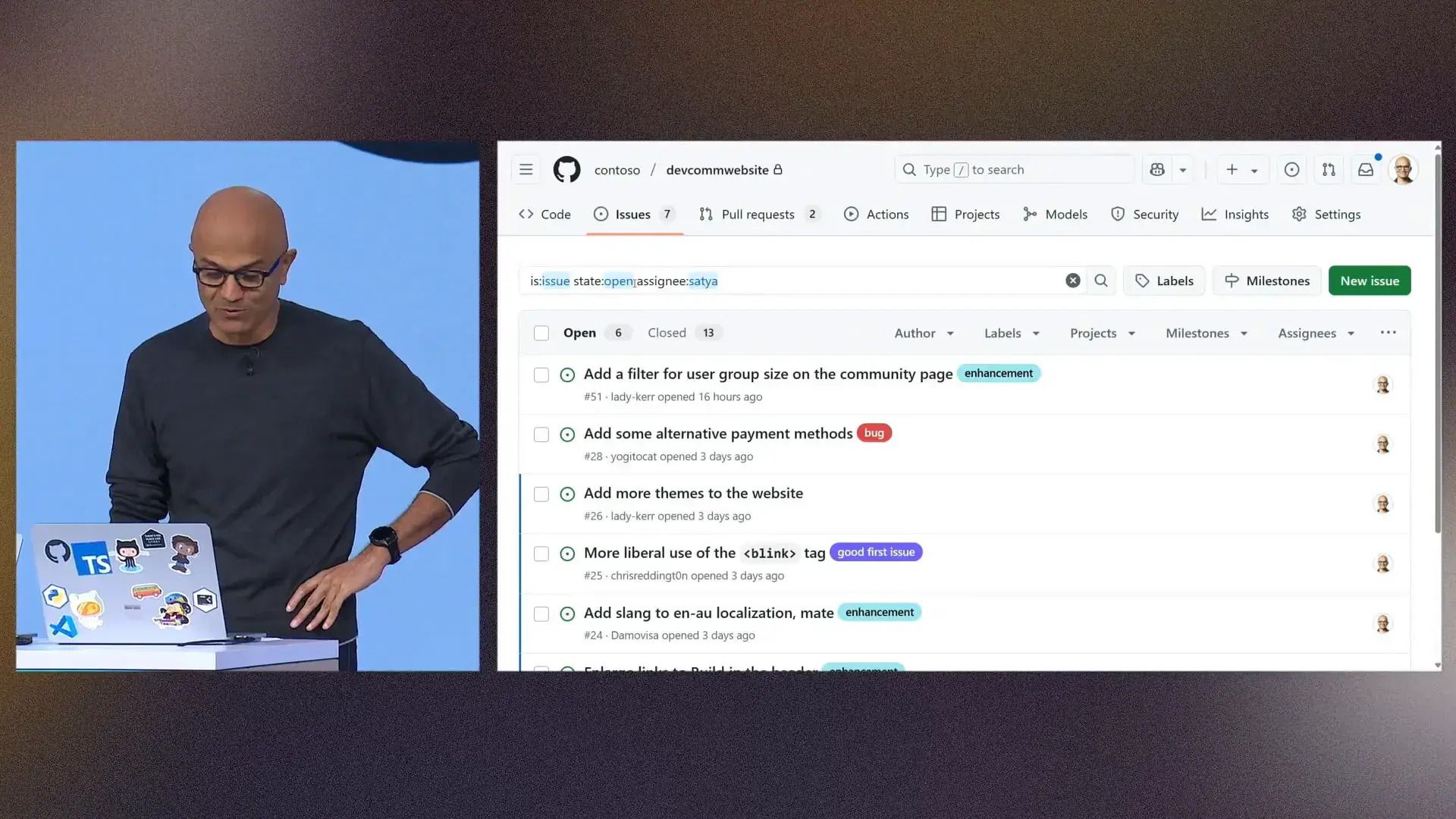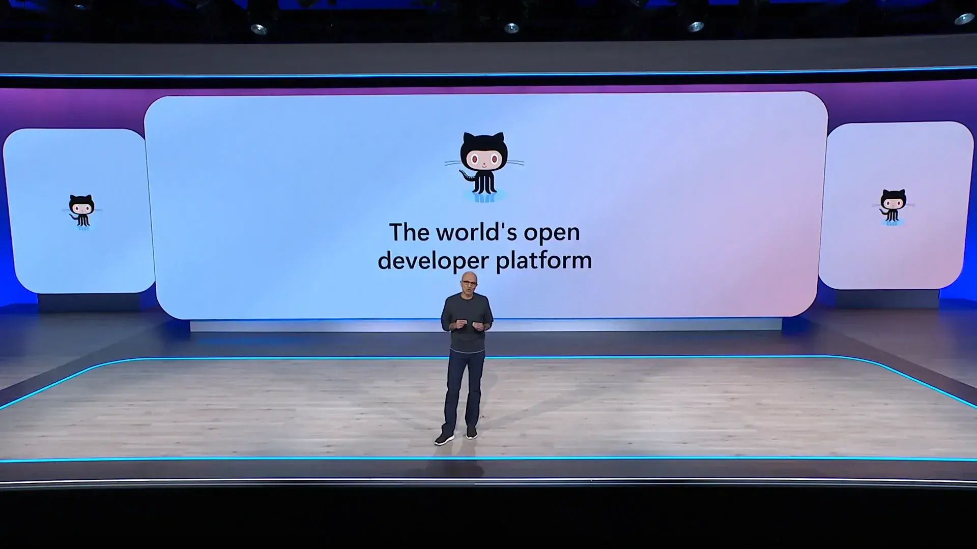 Satya เริ่มต้นด้วยการพูดถึงความสำคัญของเครื่องมือในการพัฒนาซอฟต์แวร์ที่ช่วยให้นักพัฒนาสามารถสร้างสรรค์ไอเดียและจัดการกับความซับซ้อนได้ดียิ่งขึ้น โดย Visual Studio มีผู้ใช้งานมากกว่า 50 ล้านคน GitHub มีผู้ใช้ถึง 150 ล้านคน และ GitHub Copilot ถูกใช้งานโดยนักพัฒนากว่า 15 ล้านคนแล้ว