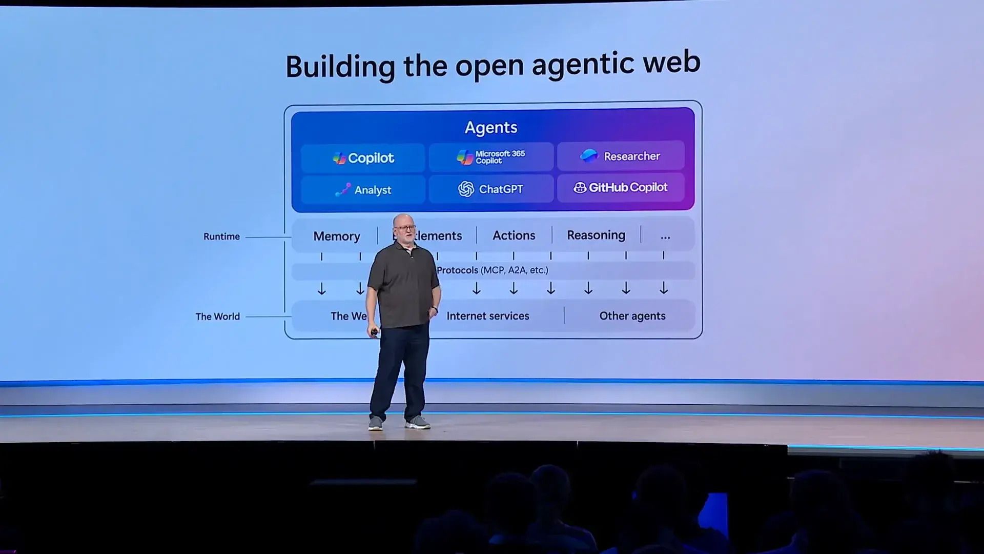 Kevin Scott ได้ให้ภาพรวมของ "เว็บเอเจนท์" ที่เป็นระบบเปิดและเติบโตอย่างรวดเร็ว ซึ่งประกอบด้วยชั้นของเอเจนท์ที่หลากหลายและชั้นการรันไทม์ที่รองรับความสามารถในการประมวลผลและเหตุผลของโมเดล AI